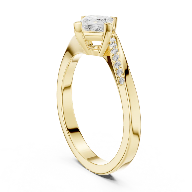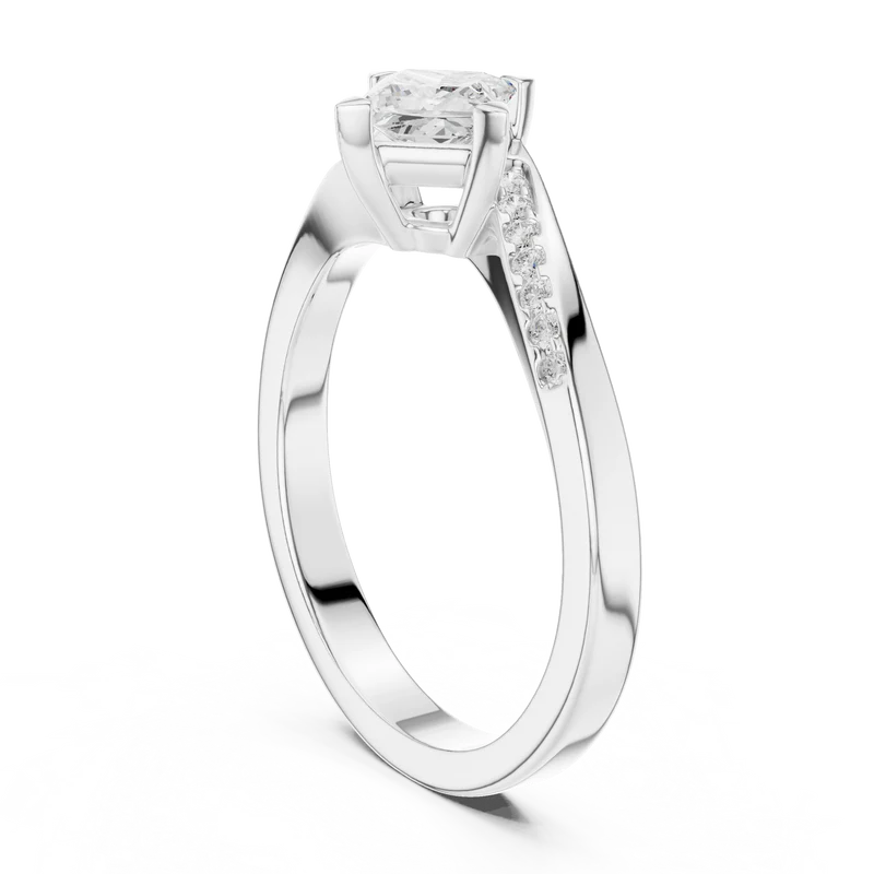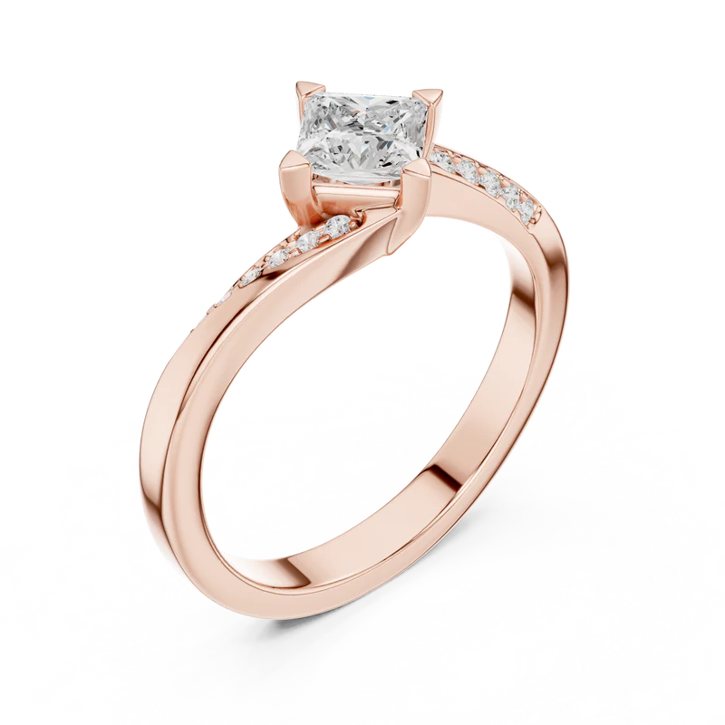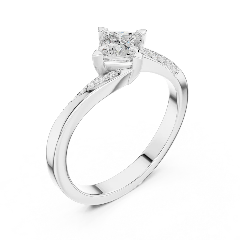 This sophisticated ring showcases a striking princess-cut diamond framed by a crisscross band lined with dazzling accents.