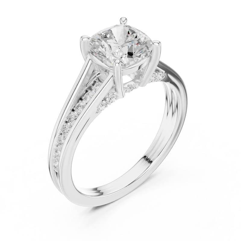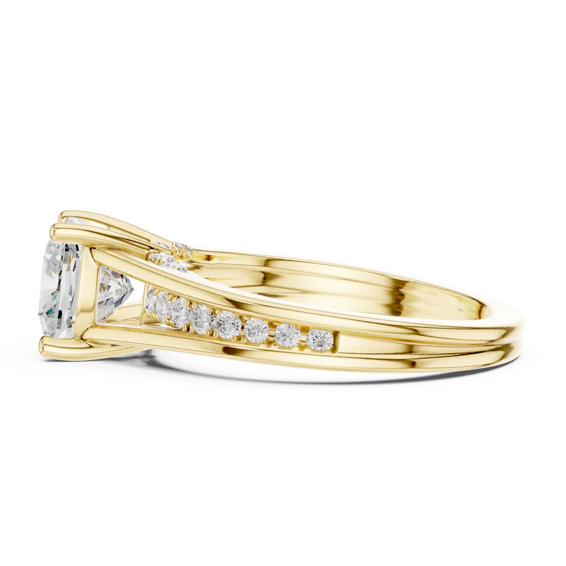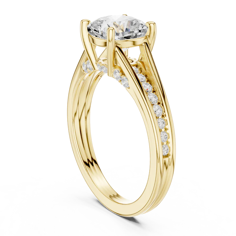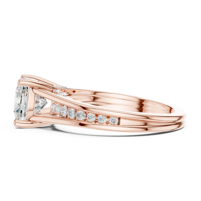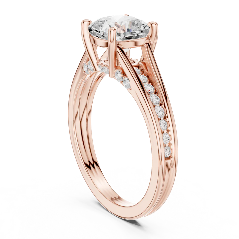 This elegant ring features a stunning diamond elevated in a refined prong setting. The band is adorned with brilliant round diamonds that add sparkle from every angle. Its geometric clarity, depth, and modern sophistication make it an exquisite piece for timeless elegance and special occasions.