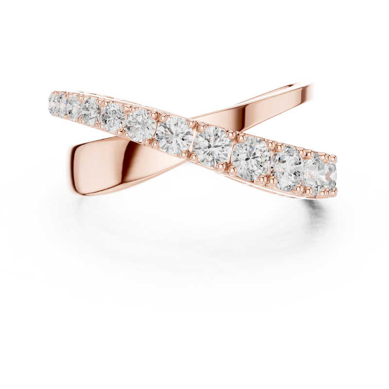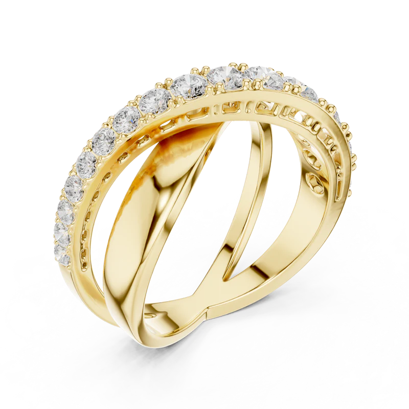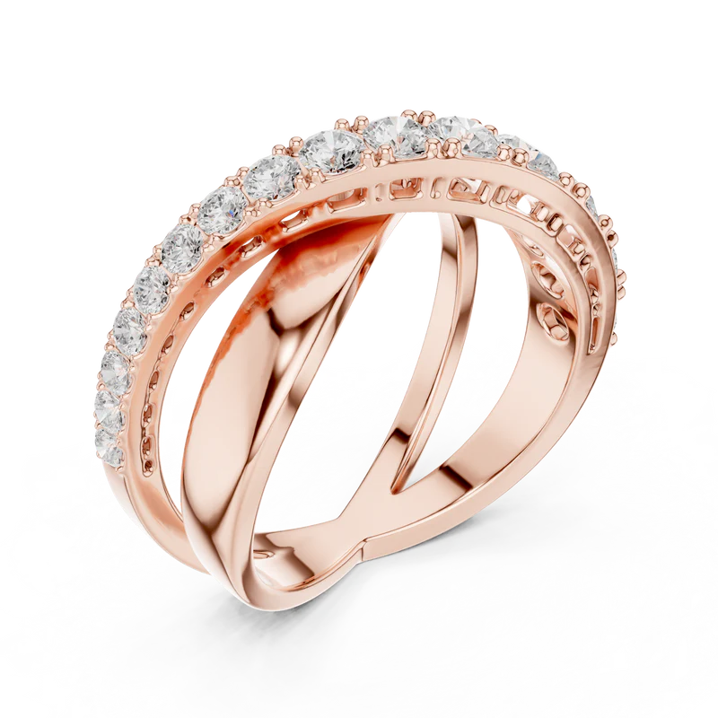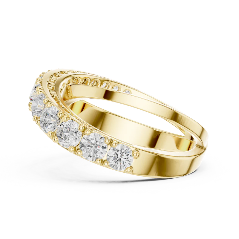 Designed with precision, the ring features a flowing double-band silhouette enhanced by radiant round diamonds.
