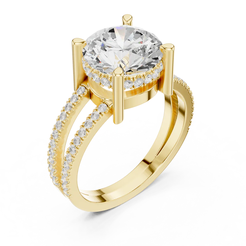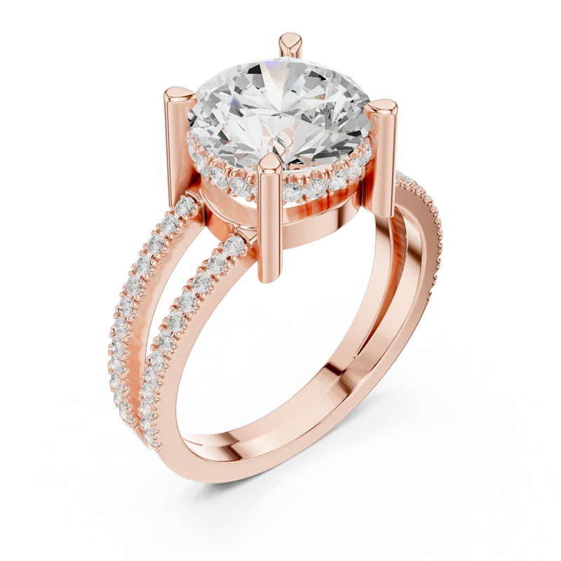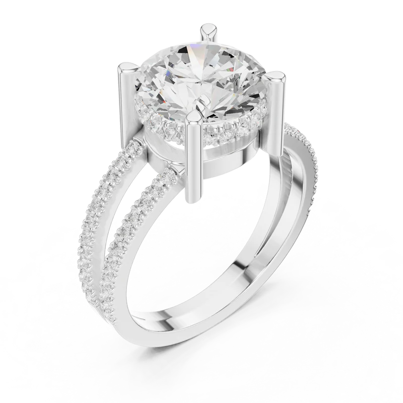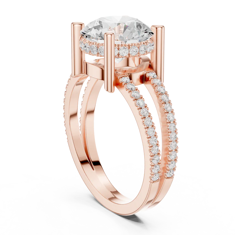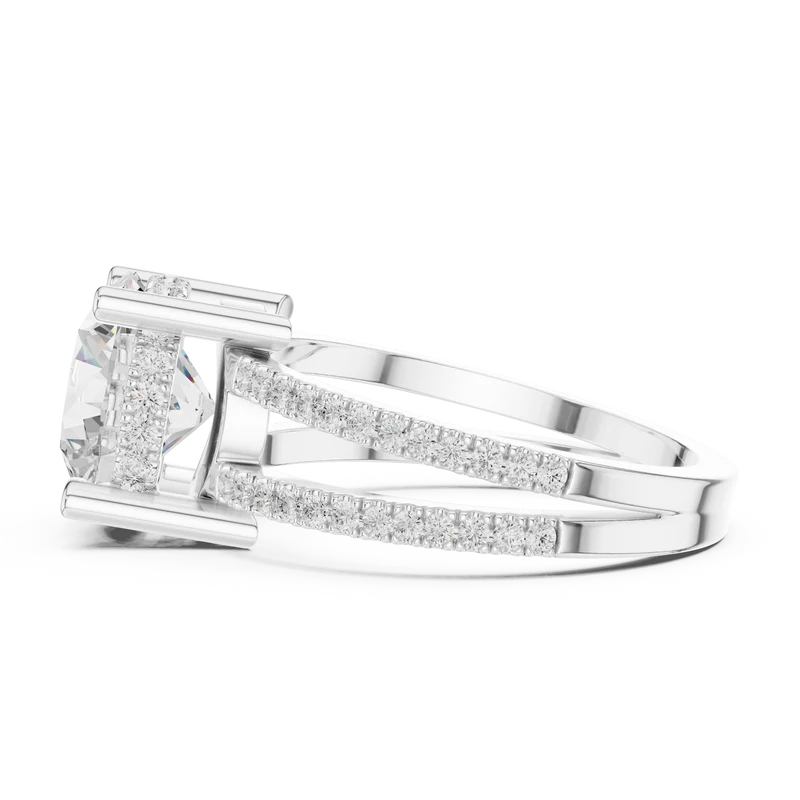 This exquisite diamond ring features a split-shank design lined with sparkling pavé diamonds. Each facet captures light beautifully, creating infinite reflections of love and luxury.